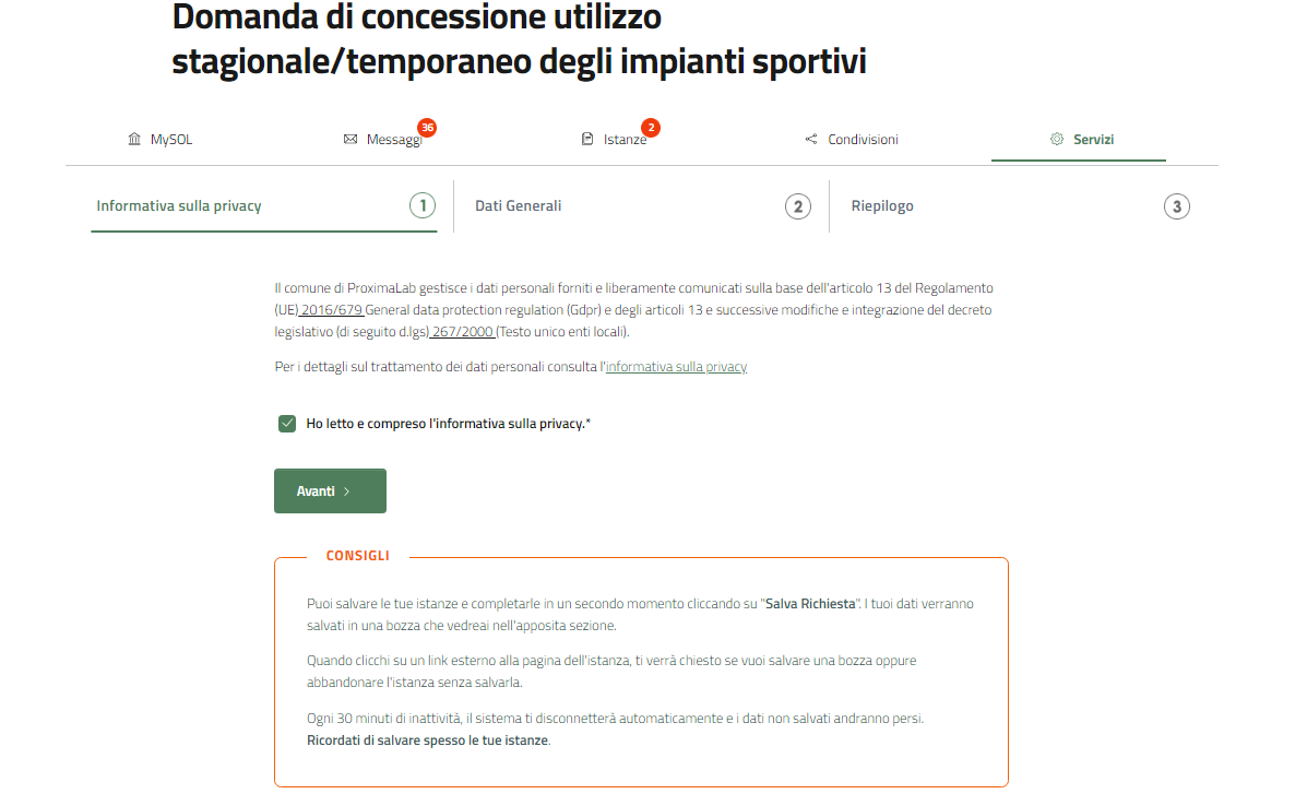 Il primo passo per richiedere la concessione di utilizzo stagionale/temporaneo degli impianti sportivi, è l'accettazione dell'informativa privacy.
