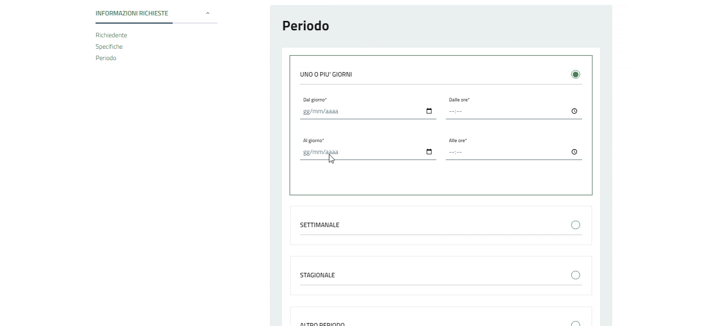 A seconda del periodo prescelto, compilare i campi che ne definiscono date e ore.